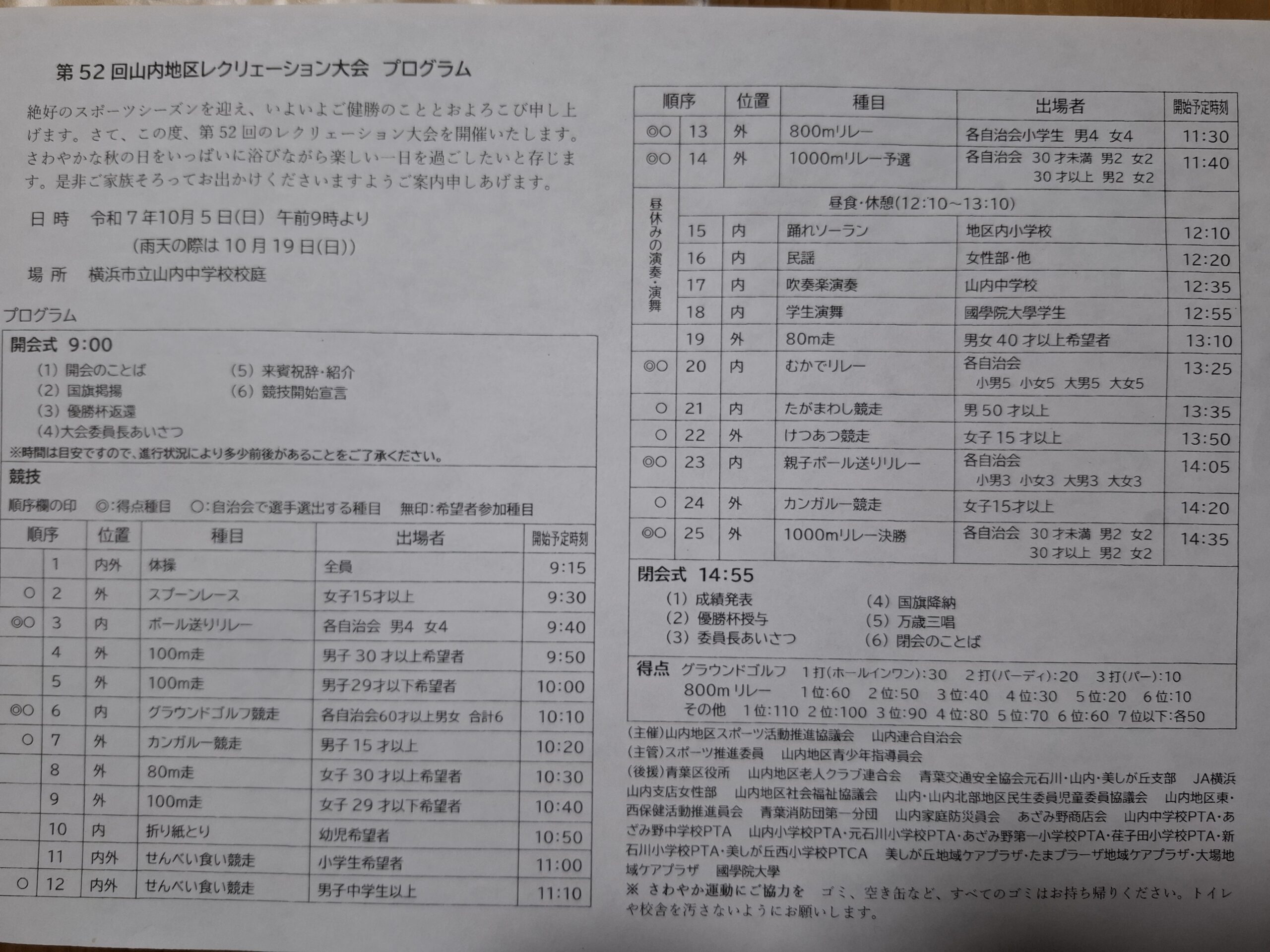 毎年恒例の山内連合自治会対抗の運動会が開かれ12自治会がしのぎを削り対戦します。昨年度は成績が振るわず残念な結果でしたが、今年は老若男女の各世代が上位をめざしてがんばります。お時間がございましたらご参加・応援をよろしくお願いいたします!ご参加いただいた方には、おにぎりやお茶をお出しします。