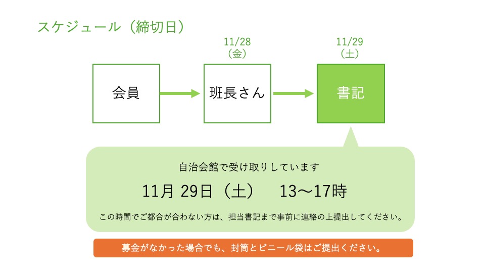 第2回班長会議でもご案内いたしましたが、以下の要領に沿って年末たすけあい募金を取りまとめ、期日までに担当書記に提出していただきますよう、よろしくお願い申し上げます。